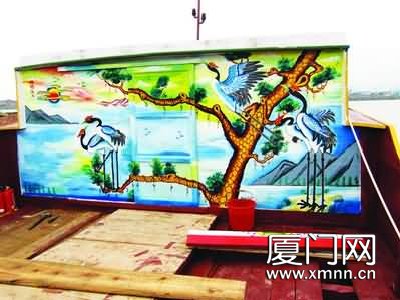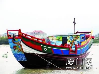 ■帆船造型流畅,色彩鲜艳。船头依传统绘上了龙的图案,以保平安。船舱也绘着松鹤延年,吉祥而醒目。