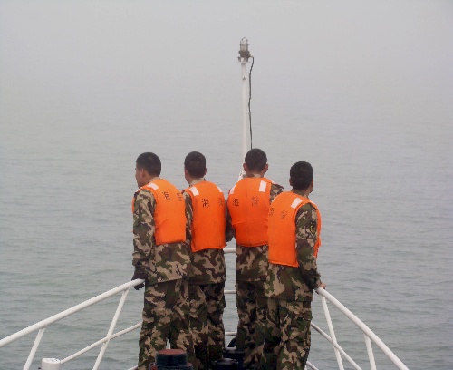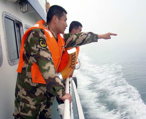温州(浙江),2010年3月19日 温州海域发生货船相撞事故 2人失踪5人获救 3月19日,温州海警官兵在事发海域展开搜救。 当日上午,浙江温州海域发生两艘货船相撞事故,造成一船沉没,7人落水,其中5人获救,2人失踪。接警后,温州海上搜救中心和温州海警官兵立即赶往事发海域开展联合搜救工作。 新华社发(骆福平 摄)