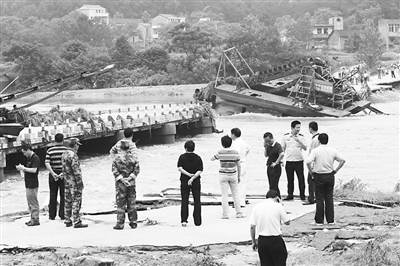 昨日,家住黄陂姚家集镇的桂师傅打算一早去滠水河对面的木里片运货,当他行至木里大桥时,桂师傅惊呆了,大桥竟然断了! 记者在断桥现场看见,在宽约百米的河面上,横跨河面的大桥被撞开了一处超过30米的口子(见图),有3艘10余米长的挖沙船正骑在垮塌的桥上,桥岸边基座处裂开。顺着河向下游走,离大桥约150米的岸边还有一艘搁浅的挖沙船,船体被岸边的电缆缠绕住了。 姚家集镇政府办公室负责事故处理的工作人员黄女士介绍,6艘肇事船只来自滠水河上游的大悟、红安及黄陂的挖沙场。从前晚8点开始,大悟、红安等地普降暴雨导致滠水河水位猛涨。所幸事故发生时船上与桥上都没有人,没有造成人员伤亡。 住在木里桥附近的黄师傅说,昨日凌晨4点多,他被巨大的噪音吵醒,出于好奇他循声而去,目睹了挖沙船撞桥的一幕。“我看到接连有几艘船撞到了桥!”黄师傅说,挖沙船撞桥时正值暴雨时河水暴涨,水位已经高出桥面约1米。 记者采访得知,挖沙船没有动力系统,工作时需固定在河岸边,行动时需要由拖船拖运,一艘10多米长的挖沙船重量约有15吨,吃水深度不到1米。 在断桥的两岸有数百居民围观,不少村民表示,这座桥塌了后从姚家集镇通往木里片得绕行20多公里,出行将十分不方便。 据了解,横跨滠水河的木里大桥竣工于2007年6月,全长108米,造价380万,是连接姚家集镇与木里片区域的重要通道,大桥被毁后周边5.8万居民出行将受影响。 原姚家集镇副镇长纪先生曾负责木里大桥建设工作,他告诉记者,大桥由市交委公路勘测设计院设计,由武汉市城发建设工程有限公司施工。因滠水河在姚家集段并非通航河道,木里大桥被设计成为了“漫水桥”,即该桥设计是允许汛期时河水漫过桥面的。纪先生还告诉记者,木里桥面距河床高度仅4.8米,镇水文记录近年来滠水河最高水位曾接近6.5米,即便如此,往年汛期木里大桥并未出现问题。 据透露,黄陂区交通部门勘测后认为木里大桥已无修复价值,为方便河两岸居民出行,交通部门将尽快拿出木里大桥重建方案并施工重建。 |