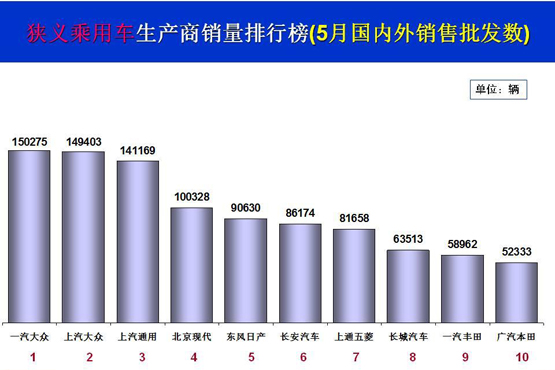 5月乘用车销量前十:一汽大众再夺冠