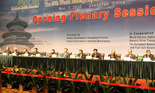 2010年11月5日上午10:00,第二十五届世界纯电动车、混合动力车和燃料电池车大会暨展览会(EVS25)在中国深圳举行开幕式。中国汽车工程学会名誉理事长邵奇惠、EVS25组委会主席、中国电工技术学会副理事长段瑞春、中国机械工业联合会副会长、中国汽车工程学会理事长张小虞出席开幕式,中国汽车工程学会秘书长付于武主持开幕式。