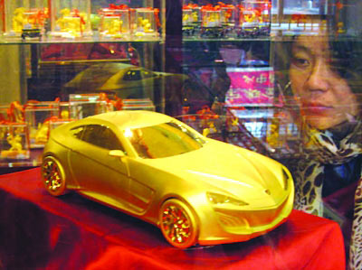 5公斤重,价值300万纯金车模亮相南京,比一般真跑车还贵 昨天,在南京宝庆银楼举办的金条展上,一辆由纯金打造的黄金汽车在南京首次亮相,成为当天展会最大的亮点,别小看它只是一个汽车模型,它可用了足足5公斤黄金,按时下的金价计算,市价值300多万元呢,一点不比那些真正的跑车便宜。记者在展销会上看到,除价值不菲的黄金跑车外,宝庆银楼今年还推出了兔年生肖金条、记载祖宗渊源的姓氏金条等特色产品,重量从10克到1.5千克不等。其中,投资金条在上海金交所基础金价上每克加价10元销售,工艺金条每克加价15元。 |