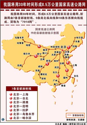 《国家高速公路网规划》采用放射线与纵横网格相结合的布局方案,形成由中心城市向外放射以及横贯东西、纵贯南北的大通道,由7条首都放射线、9条南北纵向线和18条东西横向线组成,简称为“7918网”,总规模约8.5万公里,其中:主线6.8万公里,地区环线、联络线等其他路线约1.7万公里。