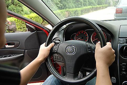 正确的握方向盘姿势为握住9点和3点方向,胳膊自然弯曲