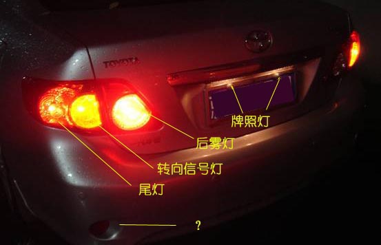 这是后面所谓的“大尺寸组合式尾灯”,包含:后雾灯、尾灯、牌照灯、转向信号灯。按照说明书上的标注如下图。