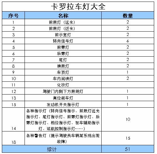 详细看了《卡罗拉用户手册》,惊奇的发现地发现车上的灯的数量可真多,由手册得知总共有51个——各位童鞋看看偶总结的全不全?,这是按照《用户手册》列出的车灯列表: