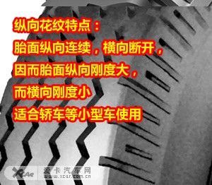 这种花纹的特点是胎面横向连续,纵向断开,因而胎面横向刚度大,而纵向刚度小。故轮胎抗滑能力呈现出纵强而横弱,汽车以较高速度转向时,容易侧滑;轮胎滚动阻力也比较大,胎面磨损比较严重。这种型式花纹适合于在一般硬路面上、牵引力比较大的中型或重型货车使用。 b)纵向花纹