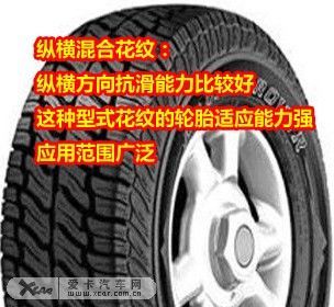 混合花纹是普通花纹和越野花纹之间的一种过渡性花纹。其特点是胎面中部具有方向各异或以纵向为主的窄花纹沟槽,而在两侧则以方向各异或以横向为主的宽花纹沟槽。这样的花纹搭配使混合花纹的综合性能好,适应能力强。它既适应于良好的硬路面,也适应于碎石路面、雪泥路面和松软路面,附着性能优于普通花纹,但耐磨性能稍逊。目前,一些货车和四轮驱动的乘用车多使用这种型式的花纹轮胎。 总结:轮胎花纹作为提高汽车性能,确保行驶安全的重要因素。因此,如何正确选购、安装和使用轮胎花纹就显得非常重要。车主一定要多个“心眼”才行。