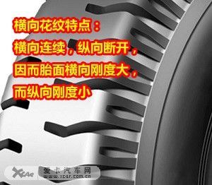 这种花纹共同特点是胎面纵向连续,横向断开,因而胎面纵向刚度大,而横向刚度小,轮胎抗滑能力呈现出横强而纵弱的特征。这种花纹轮胎的滚动阻力较小,散热性能好,但花纹沟槽易被嵌入碎石子儿。综合来看,这种型式花纹适合在比较清洁、良好的硬路面(如城市道路和高速公路)上行驶。例如,轿车、轻、微型货车等多选择这种胎纹。 c)纵横混合花纹