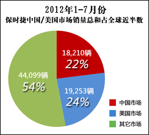 中国市场对于保时捷来说已经逐渐成为核心市场,2012年1至7月份中国贡献了保时捷全球22%的市场份额,而从上图不难看出,如果算上美国市场的话这两大市场的总和已经接近全球的一半,并且还在保持持续增长的趋势。