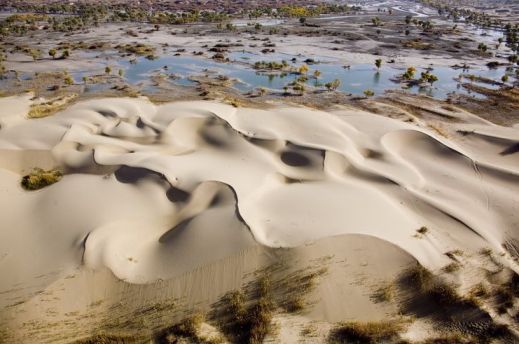 走了这条路,最大的感触就是筑路工人的伟大,他们用一把柏油和防沙带铸成的利剑,把这片世界第二大沙漠劈成两半,让我们可以进入这沙漠腹地领略大自然的壮丽。虽然沙漠风景有些单调,但老天爷特别眷顾我们,在我们造访塔克拉玛干的时候刚好沙漠里下完一场大雨,沙丘的迎光面是金黄色的沙粒,背光面被雨水凝固,使得原本单调的色彩有了明暗变化,也显得更加壮观。当地人告诉我们沙漠里下雨是非常罕见的,他们也已经多年没有见过了。
