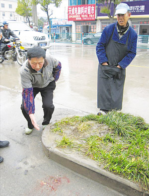 昨天下午,在事发地——掘港镇南闸大桥北100多米的花圃旁,淅淅沥沥的春雨还未完全将路面遗留的血迹冲刷干净,一摊殷红的鲜血清晰可见,甚是刺眼。从桥面开始,一道白色的印迹一直向桥下路面延伸开去,目击者称,这是轿车顶着受害者狂奔时,女工的自行车与路面摩擦留下的划痕。
