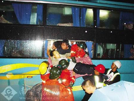 “车祸发生得太突然了,我还没反应过来,就被震得从铺位上跌落下来。”一名搭乘桂林开往深圳大客车的女乘客说,事发后,她因小腿骨折,躺在车厢的走道上动弹不得。她看到大客车的车头已面目全非,司机趴在方向盘上一动不动,白色衬衫被血染红了。被变形的座位卡住身体的乘客们发出痛苦的呻吟,车厢内一片混乱。