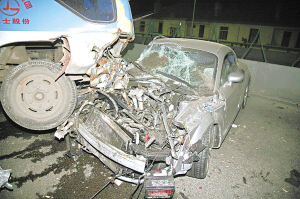 4月7日零时10分许,市北交警大队接到报警,在东西快速路三百惠西侧500米处,一辆中巴车车头压住了一辆奥迪TT跑车的车头。