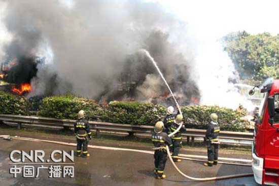 据悉,事故车辆装载了一批机器、原料和塑料制品,从广东汕头开往上海。目前,事故原因和具体损失正在调查。
