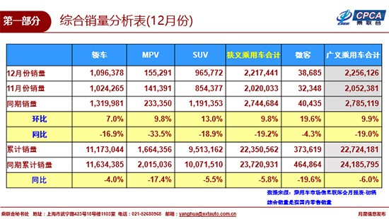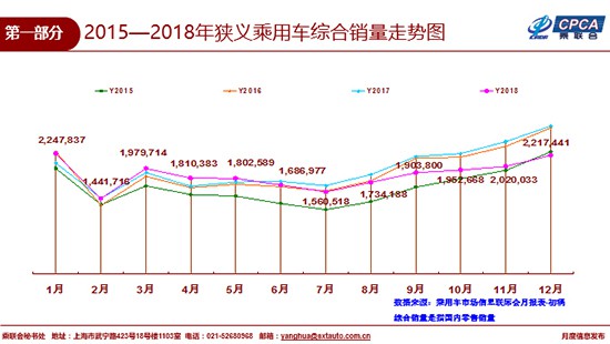 近日,全国乘用车市场信息联席会(以下简称“乘联会”)发布数据显示:2018年12月,我国狭义乘用车销量为2217441辆,同比下降19.2%,环比涨幅为9.8%。由此,我国狭义乘用车市场全年数据也正式出炉,2018年全年,我国狭义乘用车累计销量达到22350562辆,同比下降5.8%。