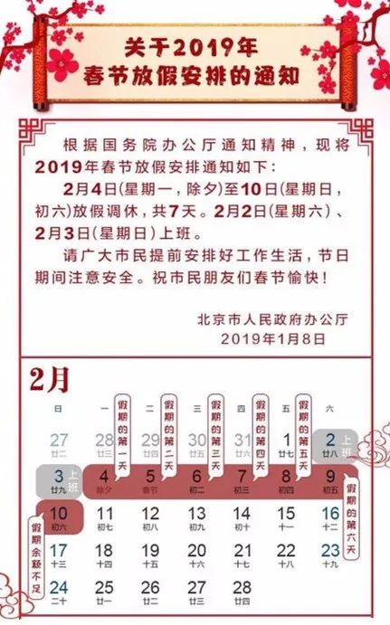 记者从北京市交管局获悉,春节期间连续9天不限行,外埠车仍需办进京证。2019年2月2日(星期六)、2月3日(星期日),2019年2月4日至10日(春节假期)期间,北京市机动车不受工作日高峰时段区域限行交通管理措施的限制;非北京市进京载客汽车不受7时至9时、17时至20时禁止在五环路(含)以内道路行驶和9时至17时按车牌尾号区域限行交通管理措施的限制。2月11日是春节长假后第一个工作日,车辆限行尾号为“1和6”。