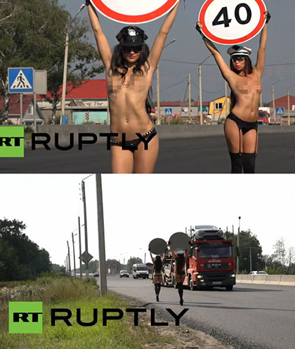 俄罗斯模特赤裸上身在公路旁高举限速牌
