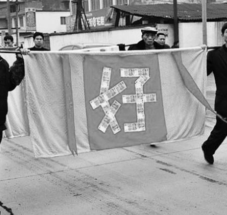 昨日,在宜宾某网络论坛上看到一篇帖子《实拍:珙县最牛“迎亲队”,100元大钞原来可以这样用!》。根据发帖者的描述,发帖者在前往宜宾市珙县的路途中,偶遇一迎亲队伍,跟传统迎亲队伍不同的是,这支队伍用百元人民币拼成了“囍”字,被网友封为“最强"囍"事”。
