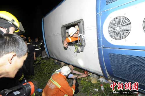 5月31日晚上21时10分许,常台高速G15W109KM+200M处(原乍嘉苏高速公路苏州方向45公里处)发生一起交通事故。据高速交警介绍,该起事故造成8人死亡,7人重伤,29人留院观察。 记者采访了解到,伤者分别被送往嘉兴中医院、嘉兴武警医院、嘉兴第一医院、嘉兴第二医院和嘉兴妇保医院救治。 记者在嘉兴第一医院急诊室了解到,该院收治了10余人,其中重症病房3人,其他为轻伤和一般皮外伤。据参与急救的医生介绍重症病房的病人目前还在抢救中。 在嘉兴第一医院急诊室,记者采访到了与这起事故死伤者同车的王女士。她告诉记者她们一行60余人是山东泰安市人,均是宁波三生公司在泰安地区的经销商。5月27日上午分乘一大一小两部车从山东泰安出发前往宁波参加三生公司的经销商大会。5月31日下午6时许王女士和其他60多名经销商乘坐原车(大车乘坐45人,小车乘坐20余人。)返回山东泰安。当晚8时许在服务区吃完饭后,小车在前大车在后继续上高速行驶在常台高速G15W109KM+200M处(原乍嘉苏高速公路苏州方向45公里处)大车和一辆奥迪A4轿车发生刮擦后,侧翻在路肩外。 |