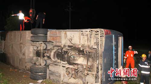 浙江嘉兴载50余人客车翻车 至少8死7人伤重